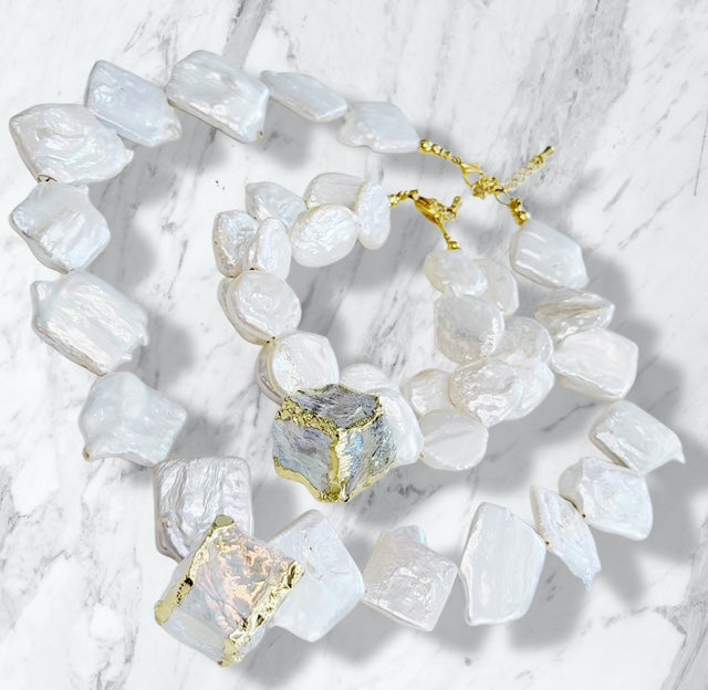 This gorgeous chunky bracelet is made with Fresh Water Pearls. The center pendant is Quartz with 24k gold plating.